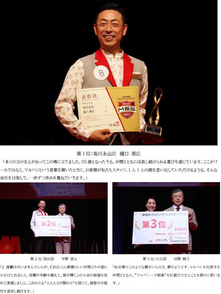 「年々大会のレベルは着実に上がり、誰がグランプリを獲ってもおかしくない“審査泣かせ”の内容でした。出場者一人ひとりの笑顔、立ち振る舞い、発声、そのすべてが堂々としていて、感動を覚える素晴らしい大会でした。これからもこの舞台を目指して挑戦を続け、日々の現場でもマルハンのサービス価値を発信していってほしいと願っています。」