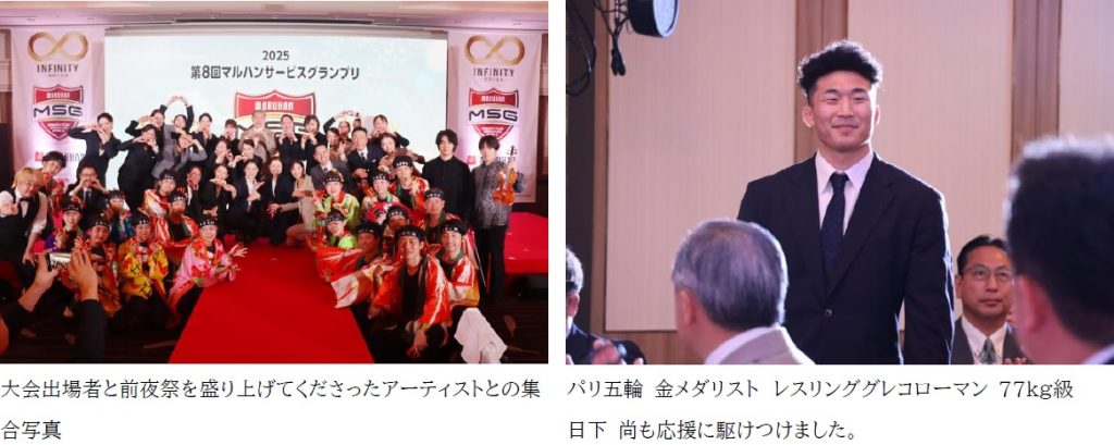 前夜祭には、クラシックデュオ「ヴァイオリニスト 和光憂人さん と ピアニスト 長尾崇人さん」、演舞団体「平岸天神」、サンドアーティスト「MASA」さんが華やかなステージを披露。また、マルハン北日本所属でパリ五輪金メダリスト・レスリンググレコローマン77kg級の日下 尚も登場し、出場者へ熱いエールを送りました。