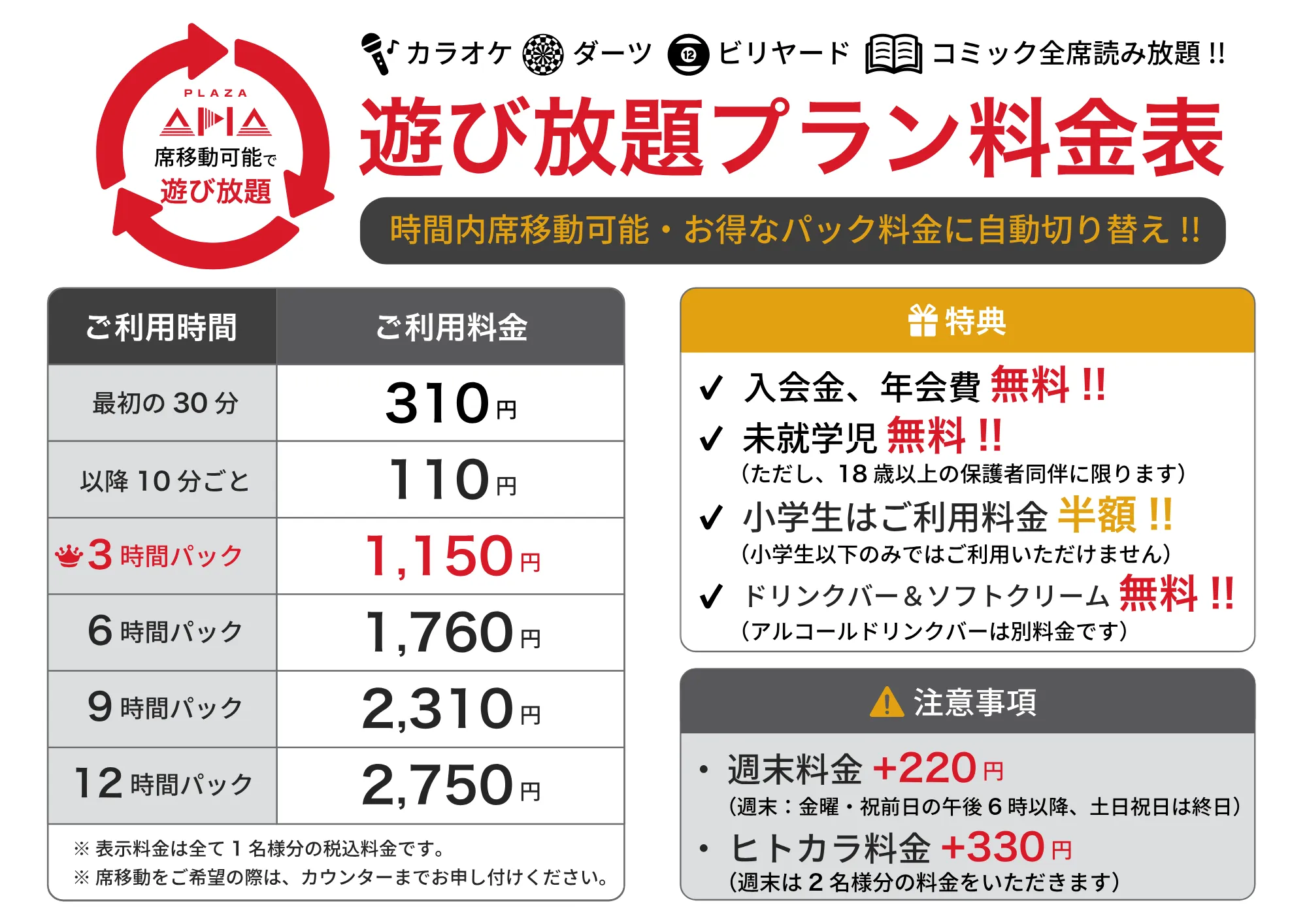 「遊び放題プラン料金」カラオケ・ダーツ・ビリヤード