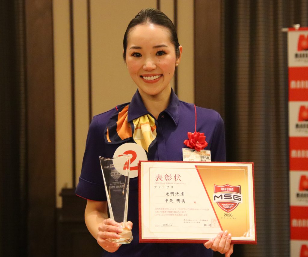 「この一年、多くの皆様に支えていただきながら、自身の接客を見つめ直し「お客様にとって本当に心地よい接客とは何か」を自問し続けてまいりました。日々の積み重ねが大きな壁を越える力となり、こうしてこの場に立てていることに、心より感謝申し上げます。昨年のMSGでは入賞を頂いたものの、なお力不足を痛感し、必ず成長して戻ると誓いました。今年、準グランプリという大きな栄誉を頂くことができ、少しだけ【明日への仕事の糧】となるようなスタッフに近づけたと実感することができました。また、今回の栄誉は、接客マナーの御指導をして下さった方々や、私の目指す接客の在り方を一緒に考え向上に取り組んでくれた、枚方店の仲間の支えがあってこそだと感じております。まだまだ未熟ではございますが、接客を通じてお客様の【明日への仕事の糧】となり、少しでも元気をお届けできるよう、これからも真摯に努力を重ねてまいります。受賞者として恥じることのないよう、自身だけでなく店舗、さらにはマルハン全体の接客向上に寄与できるよう日々精進してまいります。最後になりますが、今回西日本カンパニー大会の開催に関わって下さった全ての方々に、心より感謝申し上げます」